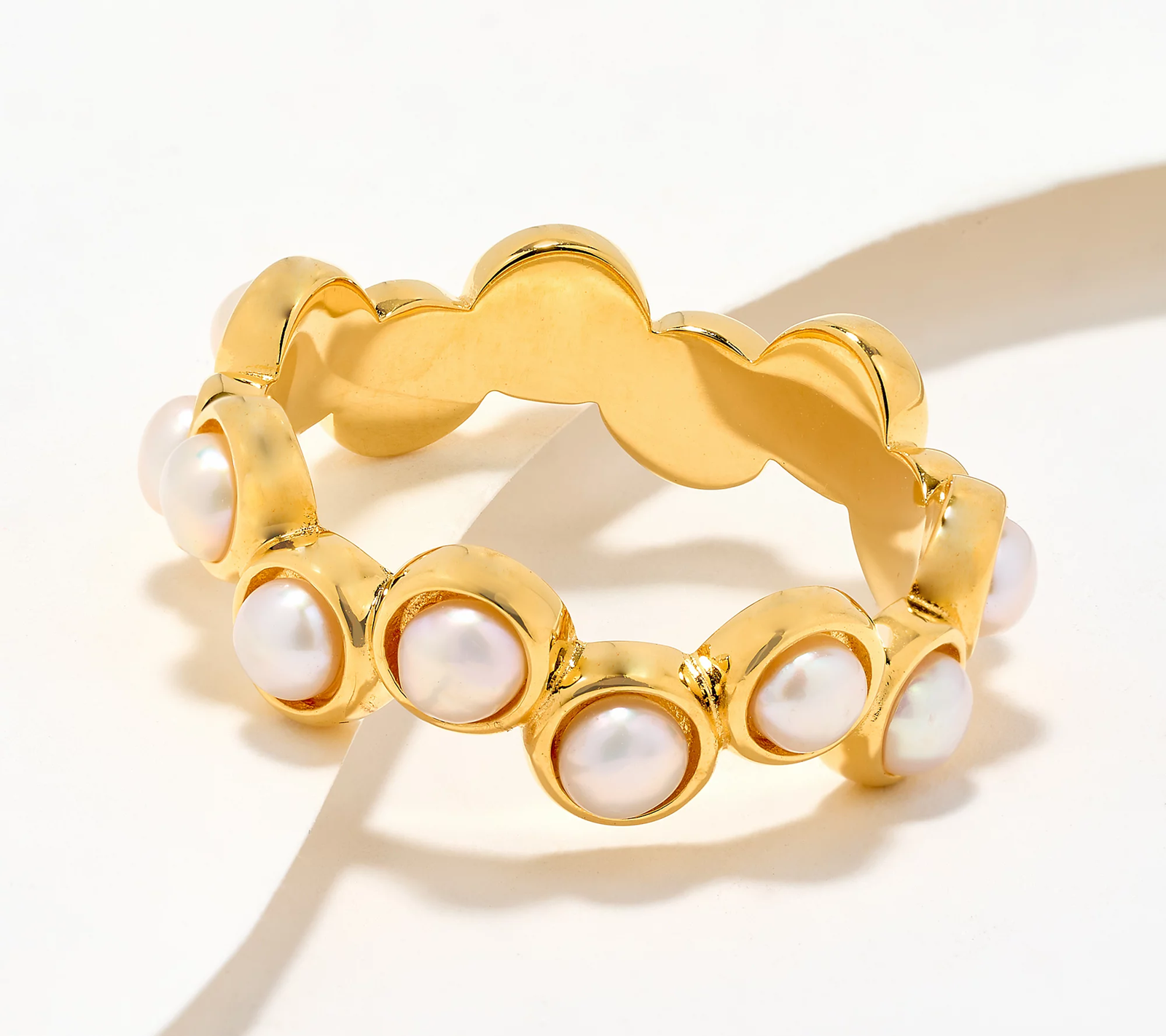 Simple yet stunning, this eternity-style band ring allows cultured freshwater pearls to dance across your finger in a zig-zag pattern. Dress up a casual ensemble with this striking piece of jewelry. From Honora.