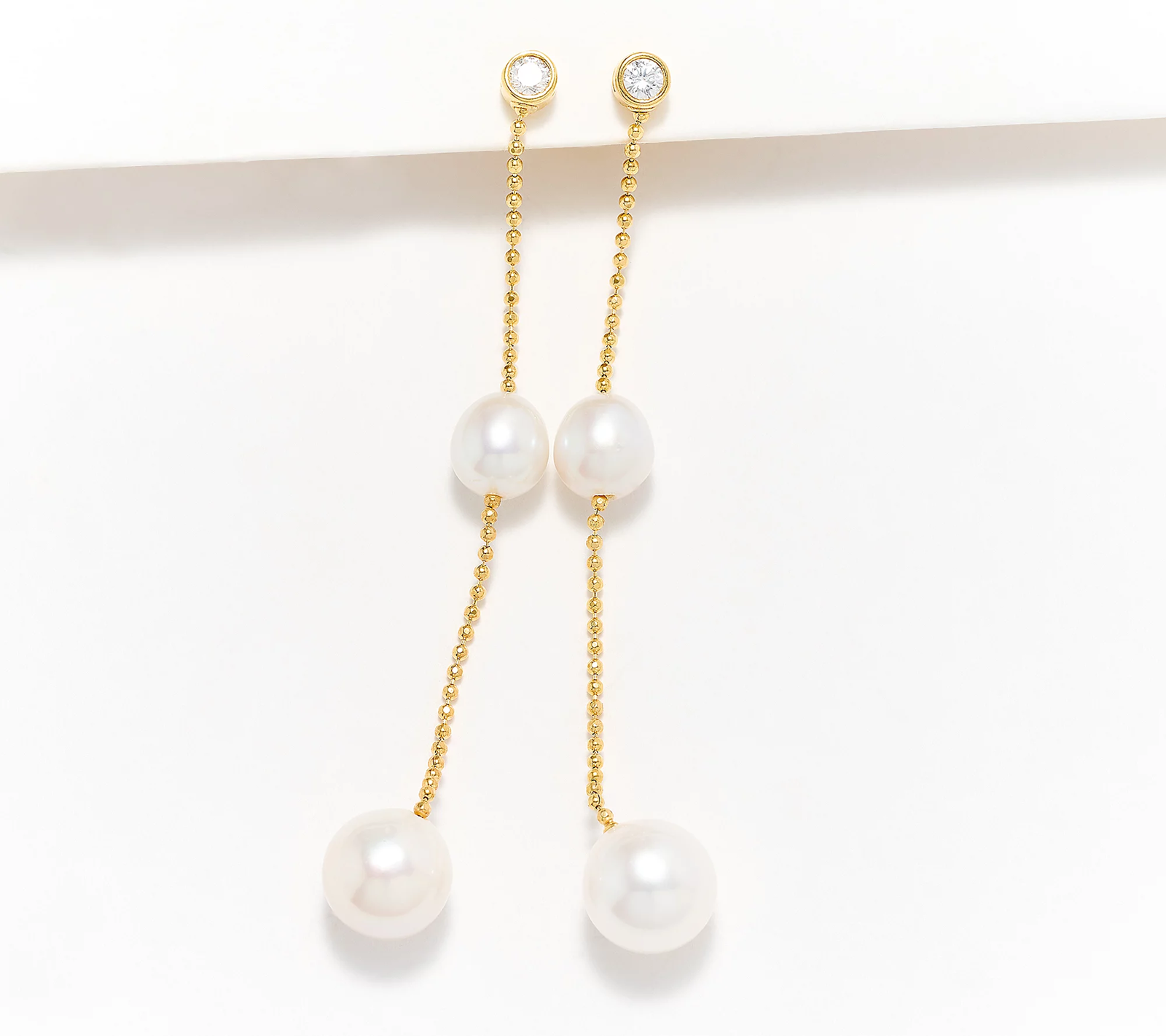 If diamonds are a girl's best friend, then pearls are a close second. These dangly earrings marry the two in a bold and vibrant way, with a chain embellished with Ming cultured pearls topped by a sparkly simulated diamond. The best of both worlds, indeed. From Honora.