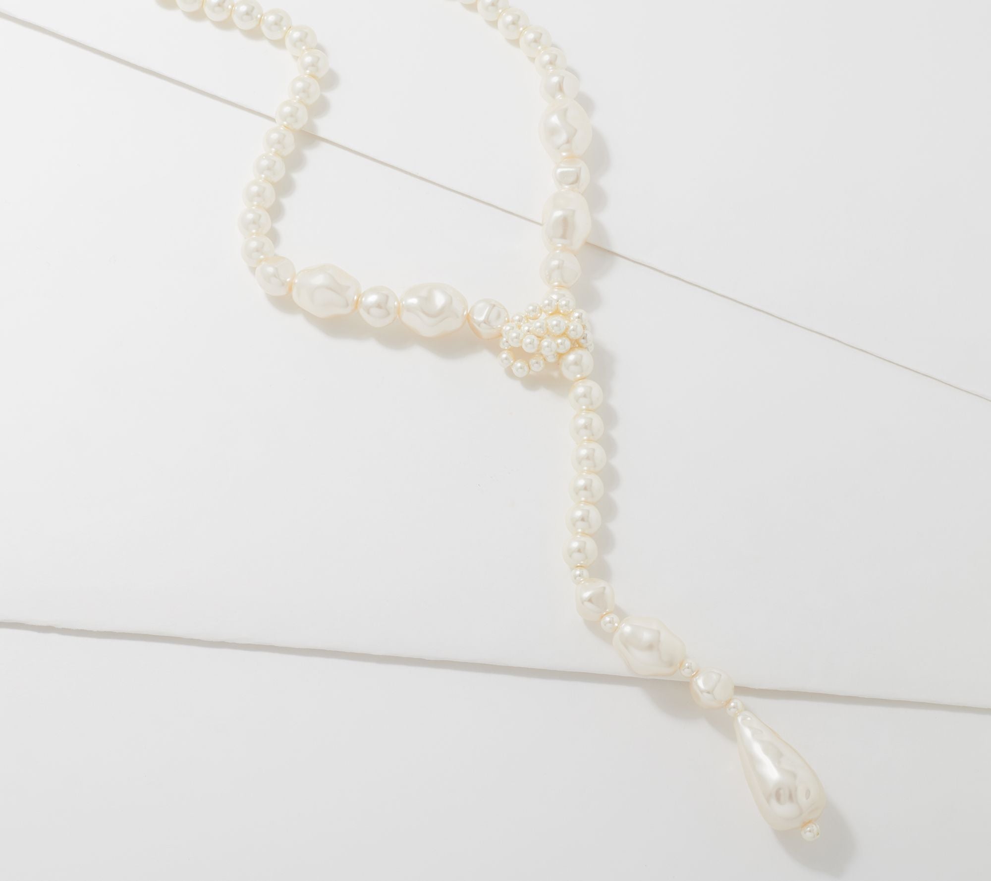 The Isaac Mizrahi Live! Goldtone Faux Cream Pearl Y Necklace (18") is a chic and sophisticated accessory that blends timeless elegance with modern flair.