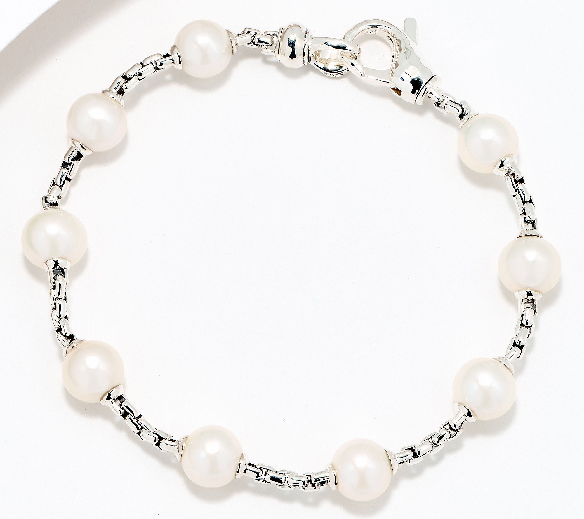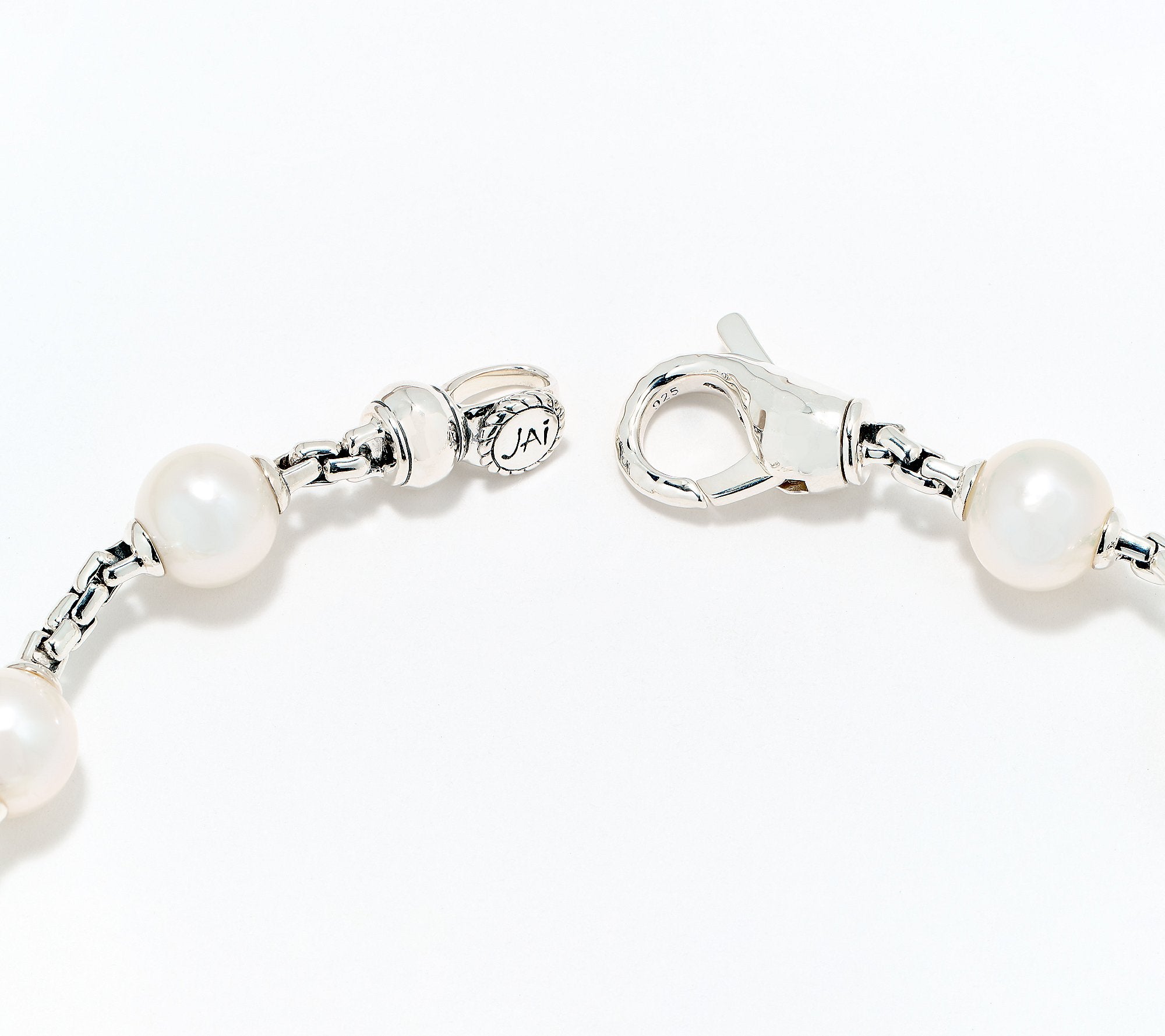 Combining cultured freshwater pearls with a sterling silver box chain, this timeless bracelet is a beautiful balance of classic and contemporary style. Every modern woman should possess a piece that transcends trends while transforming any ordinary outfit into an elegant ensemble, and this one will be cherished today, tomorrow, and far into the future. From JAI.
