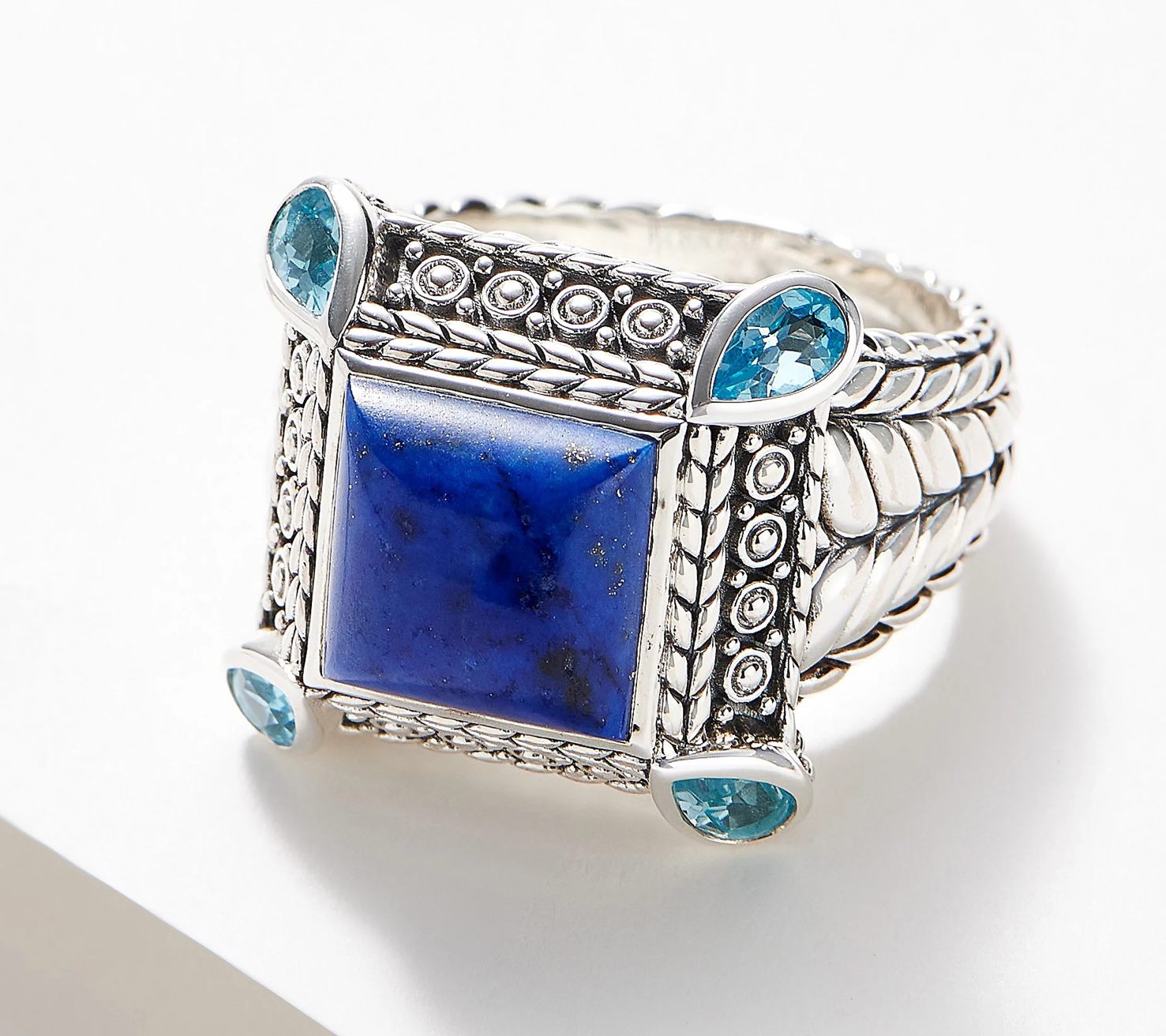 The basket weave and kalahari carved textures that sit around the center gemstone add a distinct design to this dignified gemstone ring. From JAI.