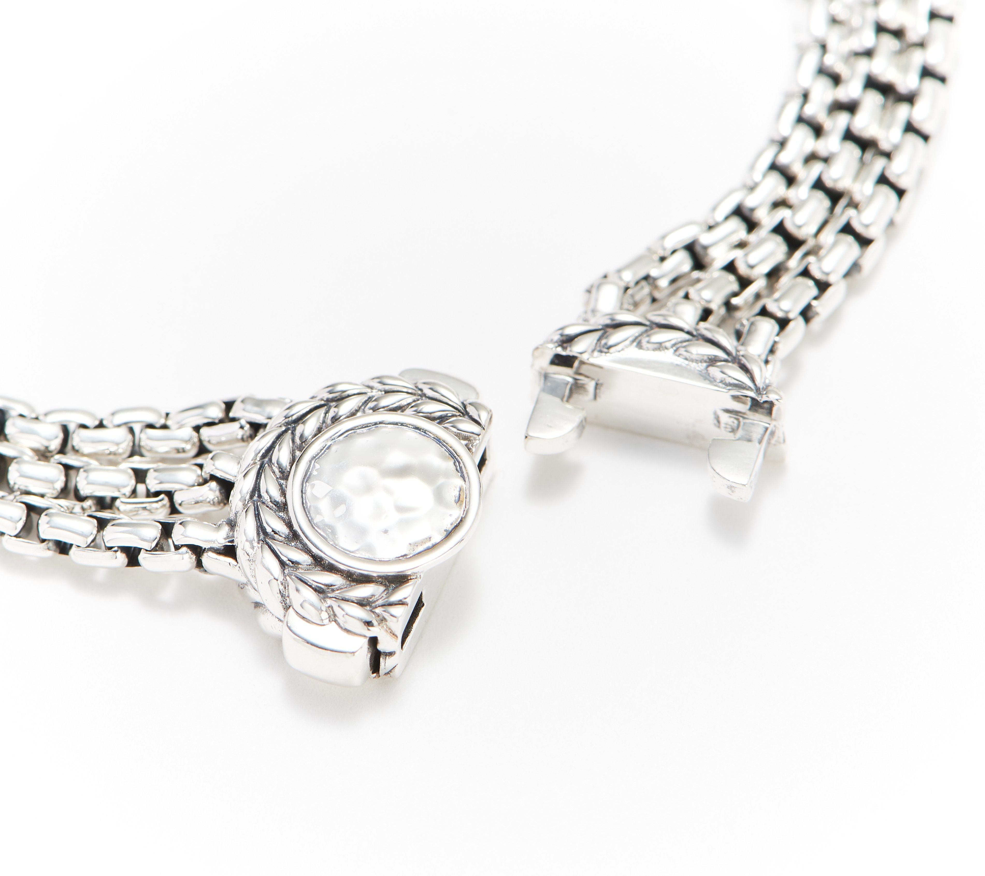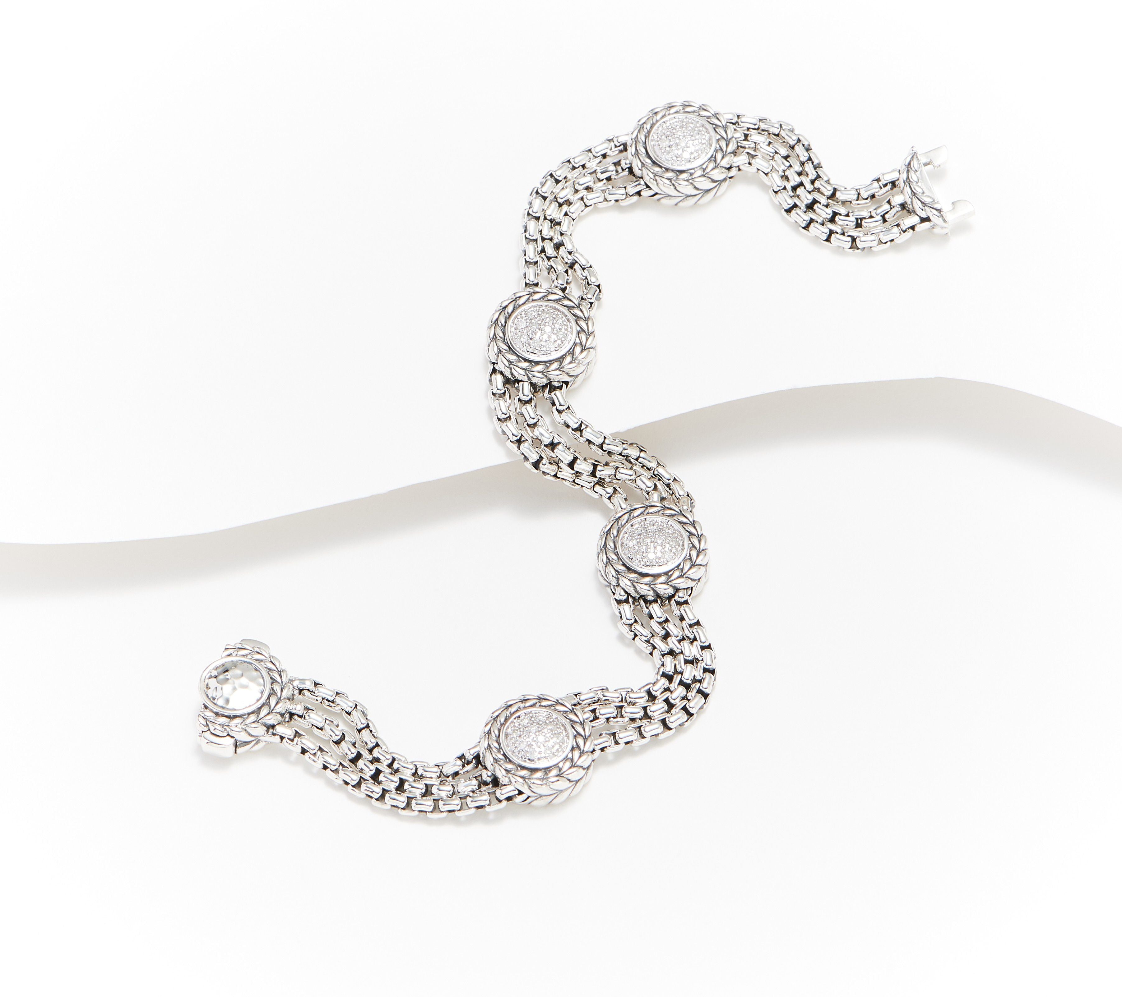 The beautifully intricate three-row chain of this sterling silver bracelet boasts four diamond stations that pop and catch the light. From JAI.