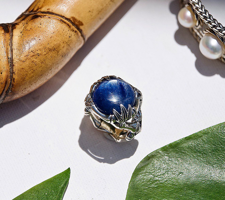 Shaped like a stalk of bamboo with its leaves firmly holding the gemstone in place, this ring is a symbol of strength, loyalty, and good luck. From JAI.
