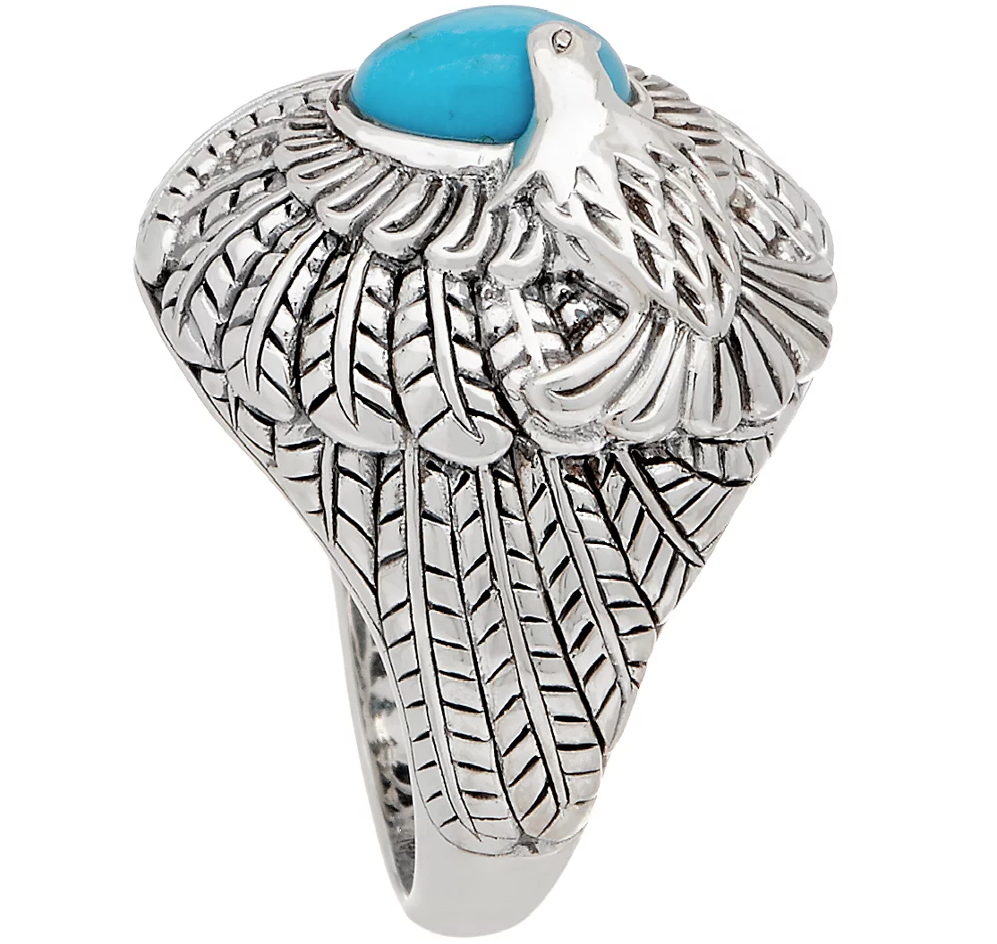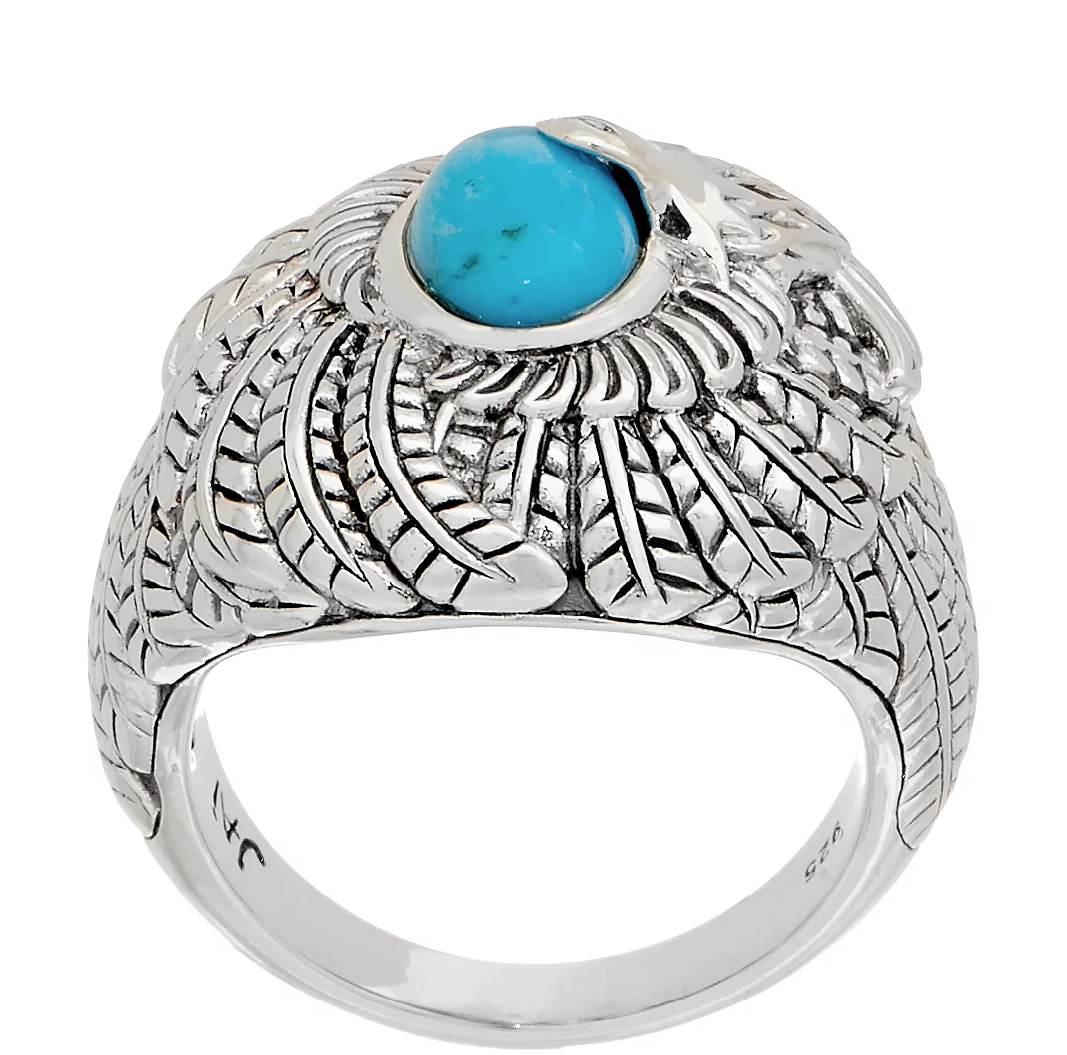 Featuring a beautifully textured eagle wrapping its wings around a turquoise cabochon, this awe-inspiring ring speaks volumes about your fearless, free spirit. From JAI.