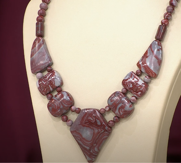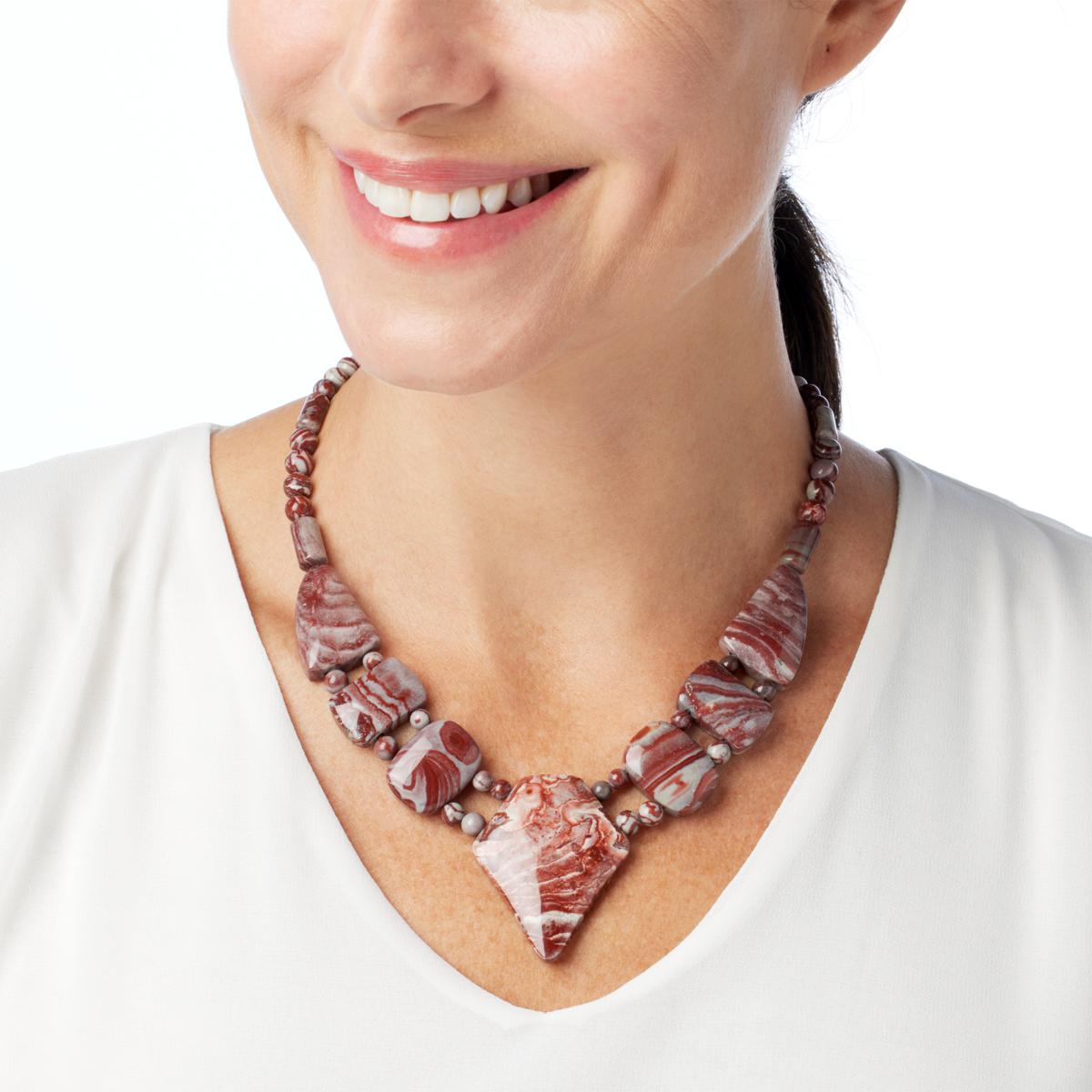 Elevate your jewelry collection with the Jay King Multicolor Crazy Lace Quartzite Necklace, a stunning piece featuring rare, natural quartzite gemstones from Mexico. With its captivating swirls of brown, white, and gray, each stone is one-of-a-kind, making this necklace a true wearable work of art. Designed for bold elegance, it effortlessly complements both casual and sophisticated looks.