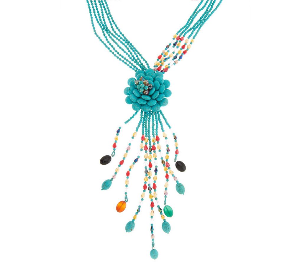 Look like a genuine Hollywood starlet with this distinctive necklace complementing your wardrobe. The asymmetrical, multi-strand design is boldly detailed with a large flower accent and a fringe of colorful beaded strands below. From Joan Rivers.