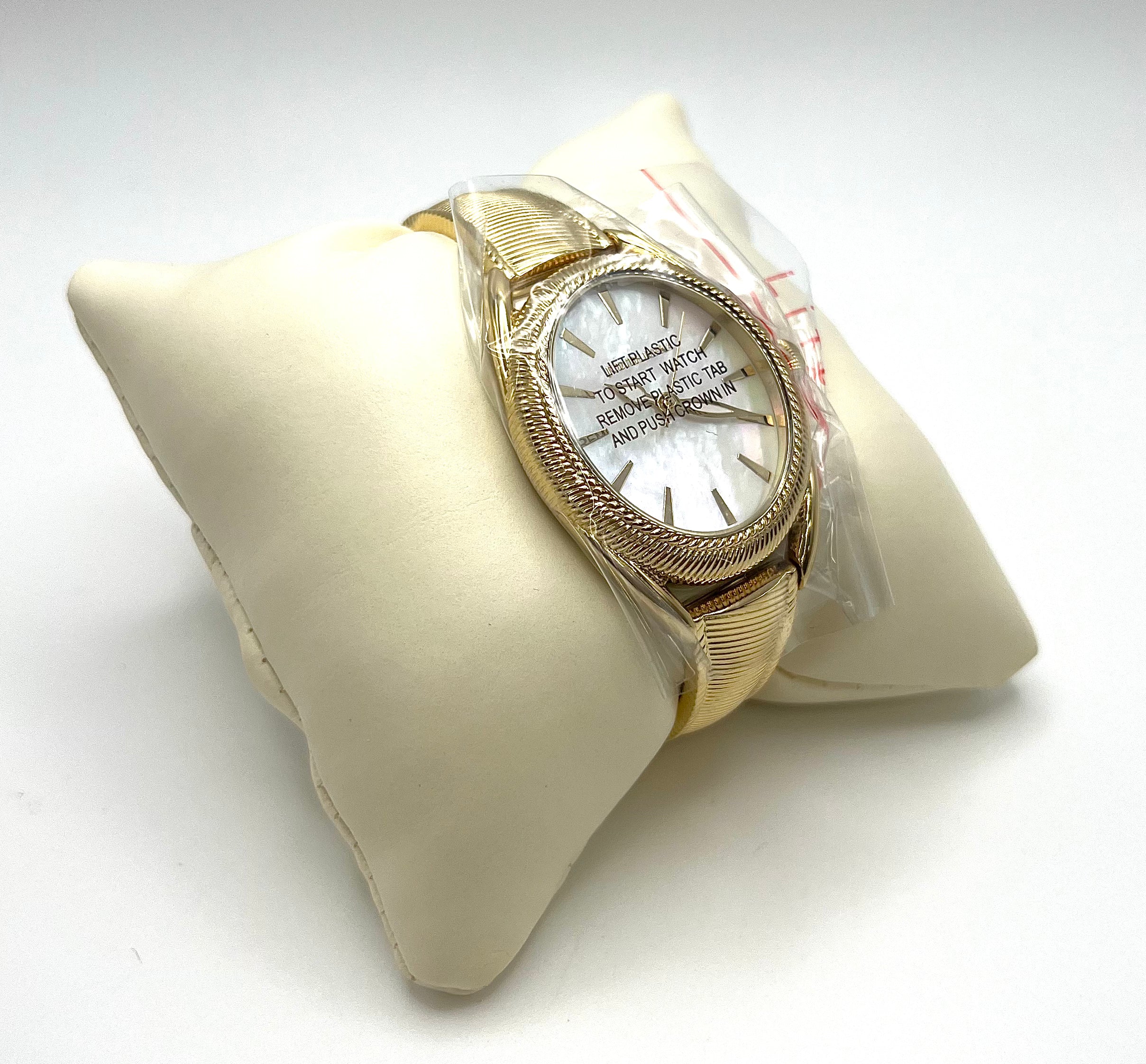 Materials: Goldtone Metal, Mother of Pearl Dial, Stainless Steel Back