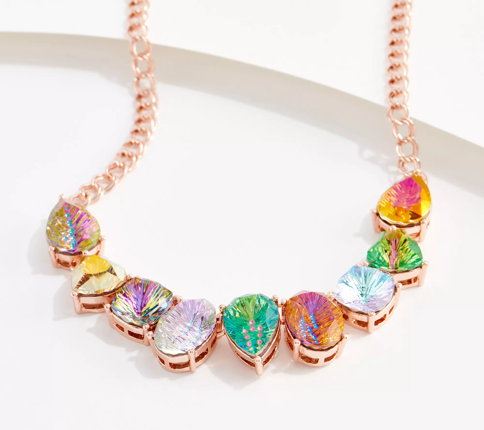 Cosmically cool, this chain necklace features fancy-cut faceted stones that shimmer in shades of teal, purple, burnt orange, and gold. Wear it on casual and dressy occasions and let it shine like the brightest star in the galaxy. From Kirks Folly.
