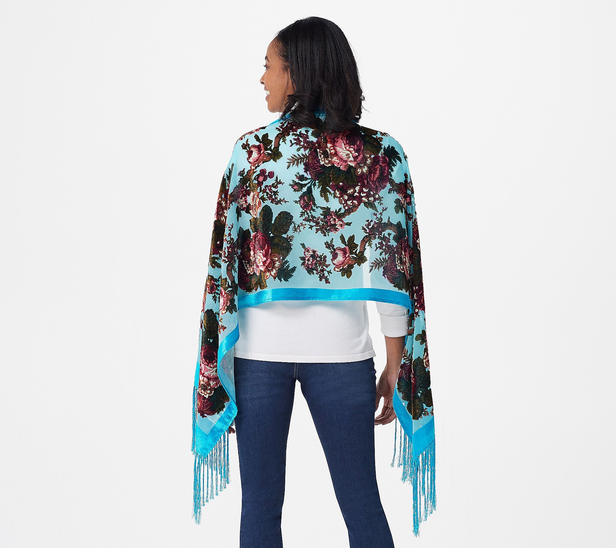 A lush velvet floral design plus sweeping tassel details give this garden fairy scarf an air of opulence. From Kirks Folly.