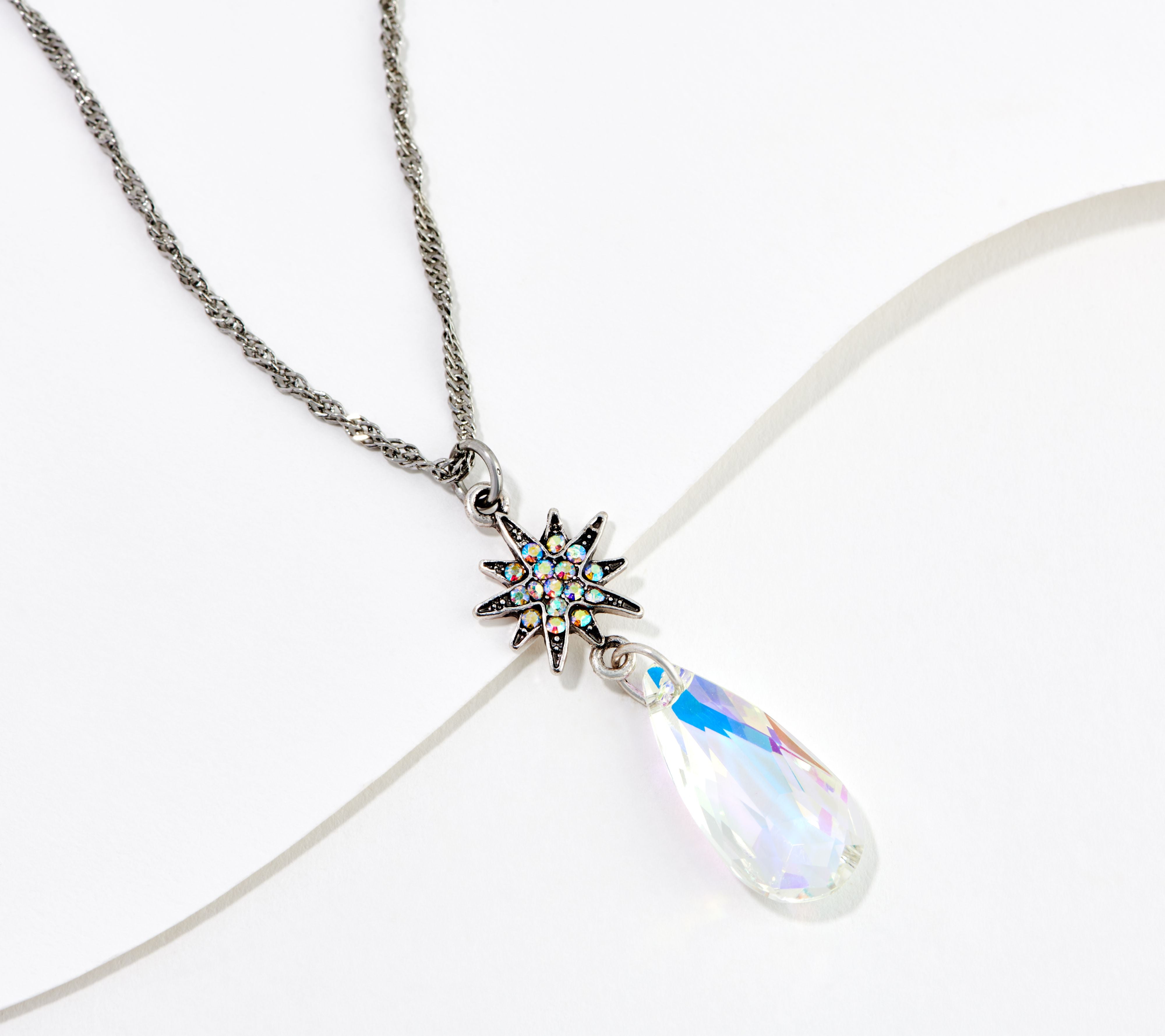 Delicate jewelry obsessed? Add this gorgeous crystal necklace to your collection to switch things up. With the classic vibes you love, and a little extra somethin' thanks to this show-stealing aurora borealis teardrop, this piece is a total jewelry box fave. From Kirks Folly.