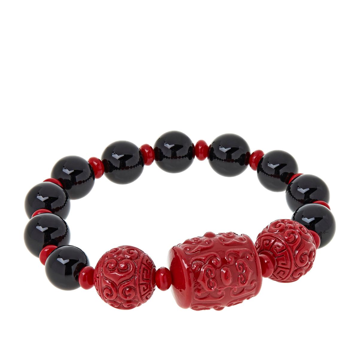 Handcarved red coral and polished black onyx beads create a chic color contrast in this easytowear stretch bracelet from Kwan Collections.