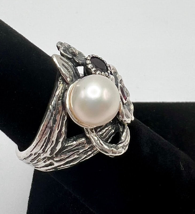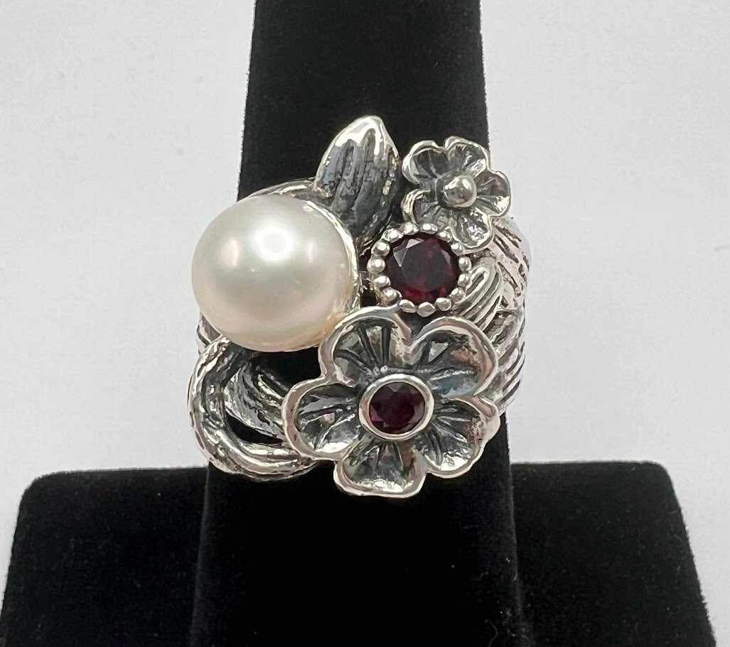 Embrace timeless elegance with the LiPaz Floral Design Sterling Silver Garnet & Pearl Ring. This beautifully crafted piece features a delicate floral motif, showcasing the natural beauty of a deep red garnet and a lustrous pearl. The intricate detailing and organic design make this ring a standout addition to any jewelry collection.