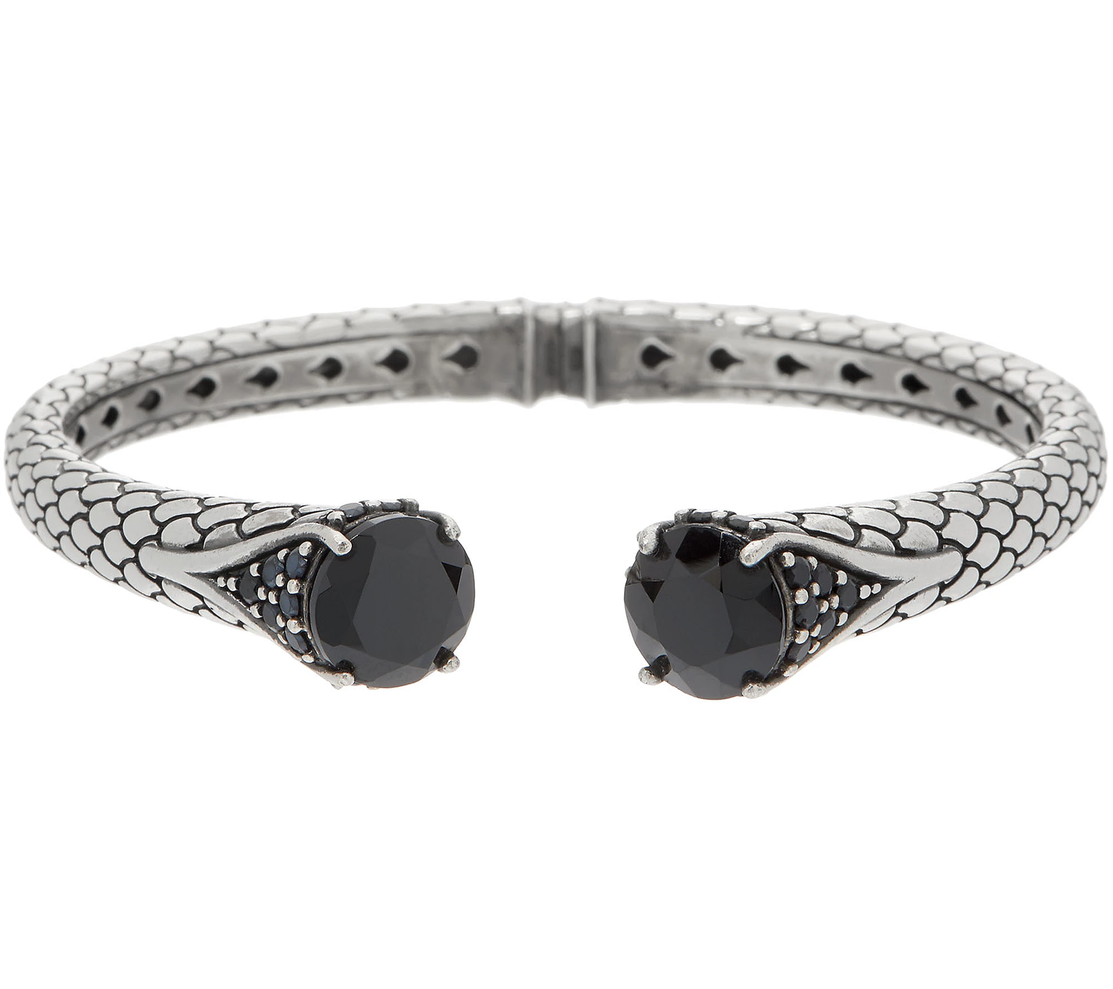 For a ravishing look, try on this sterling silver cuff bracelet. Dotted with black spinel endcaps and simulated gemstone accents, the end result is simply stunning. From Mistero.