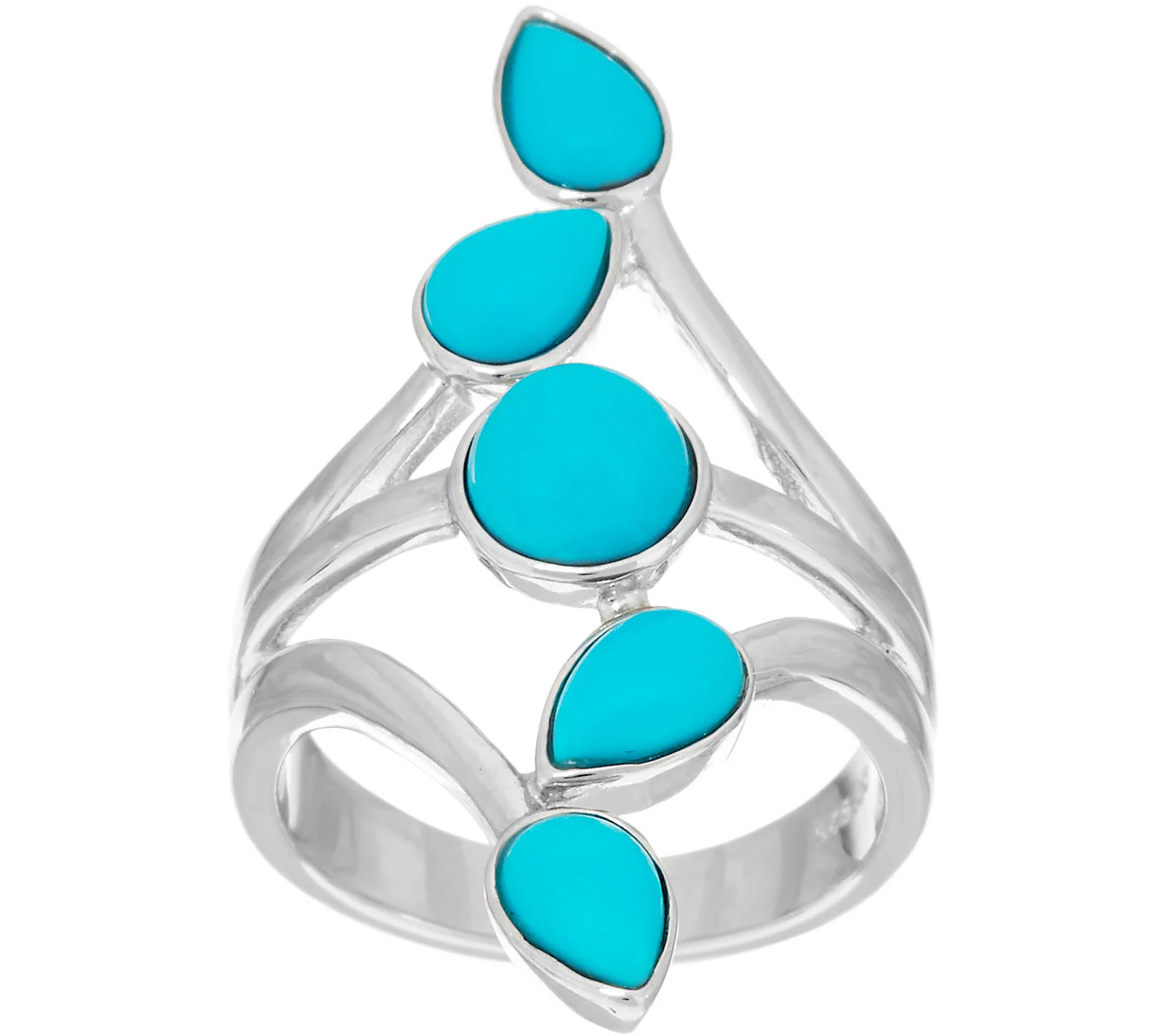 A sterling silver ring like this doesn't come along every day. Round and pear-shaped Sleeping Beauty turquoise are vertically bezel set in the elongated design. A split, three-row polished shank adds to the organic design.
