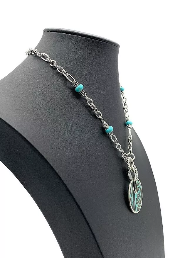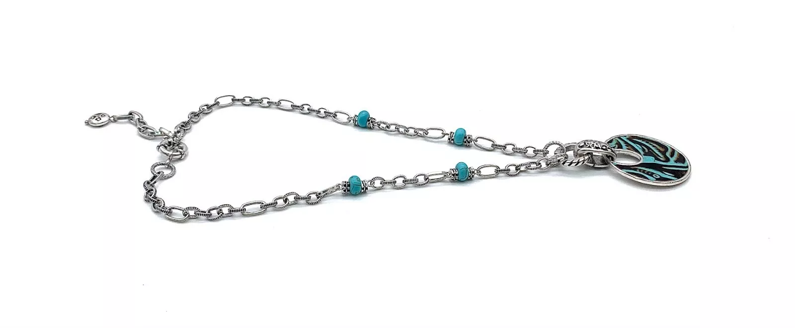 Patricia Nash Silvertone Turquoise Leather Inlay Pendant. 18"