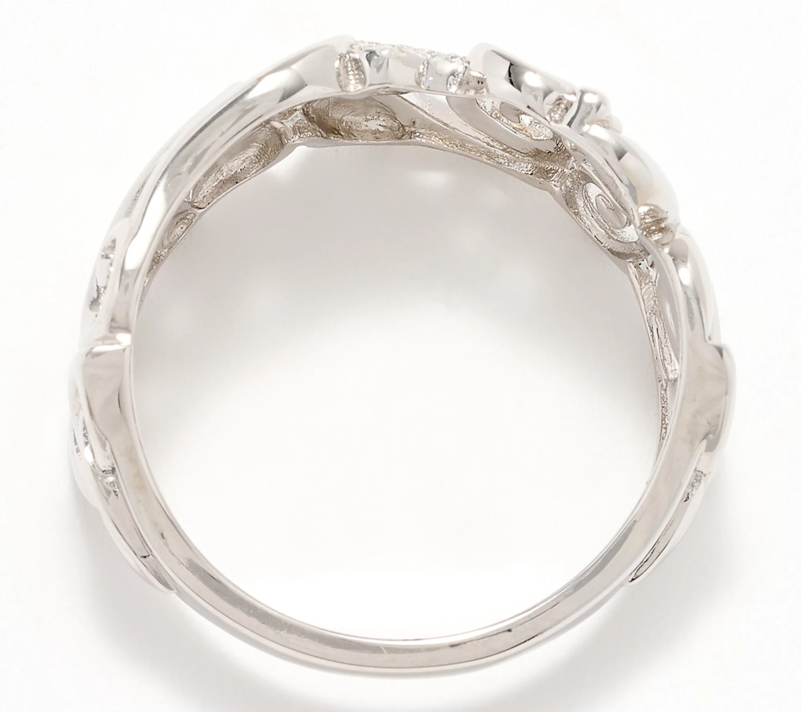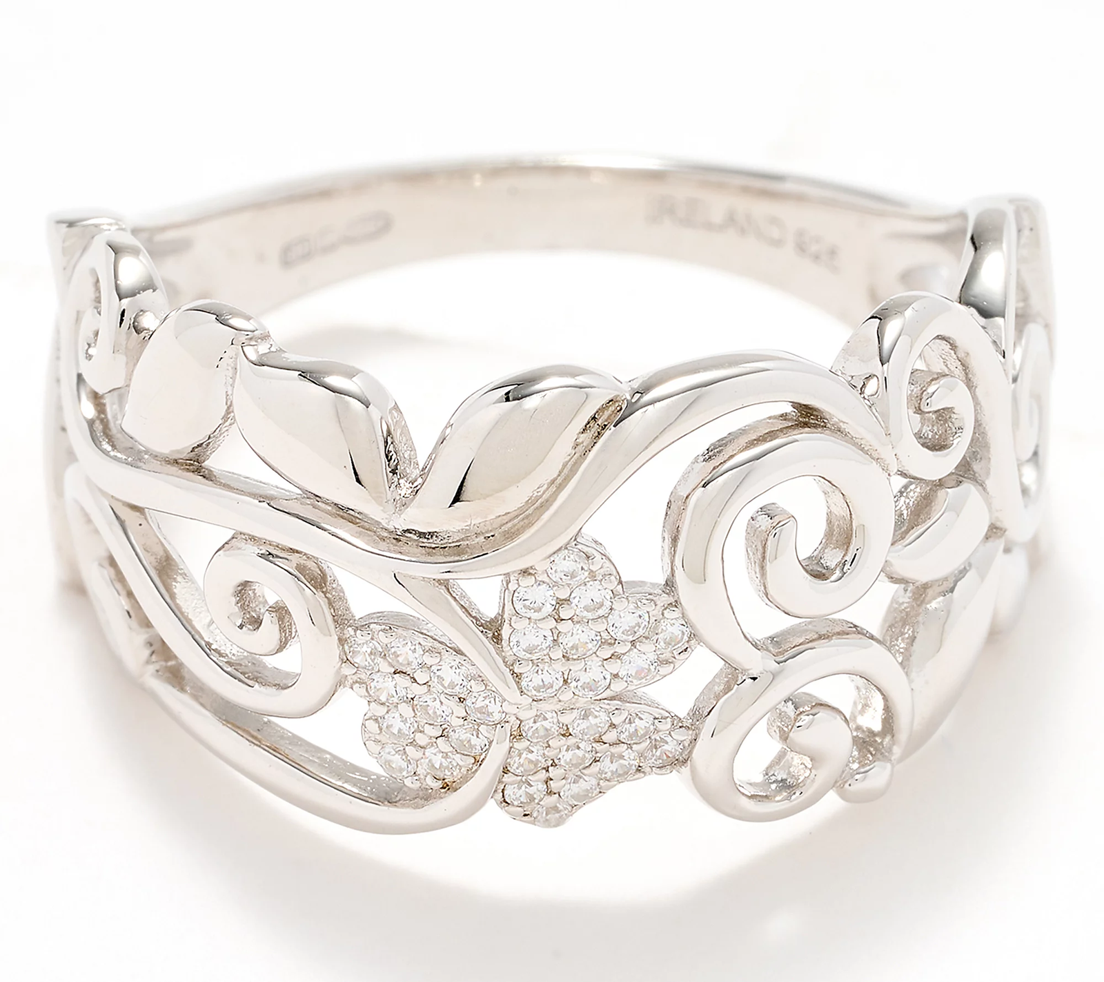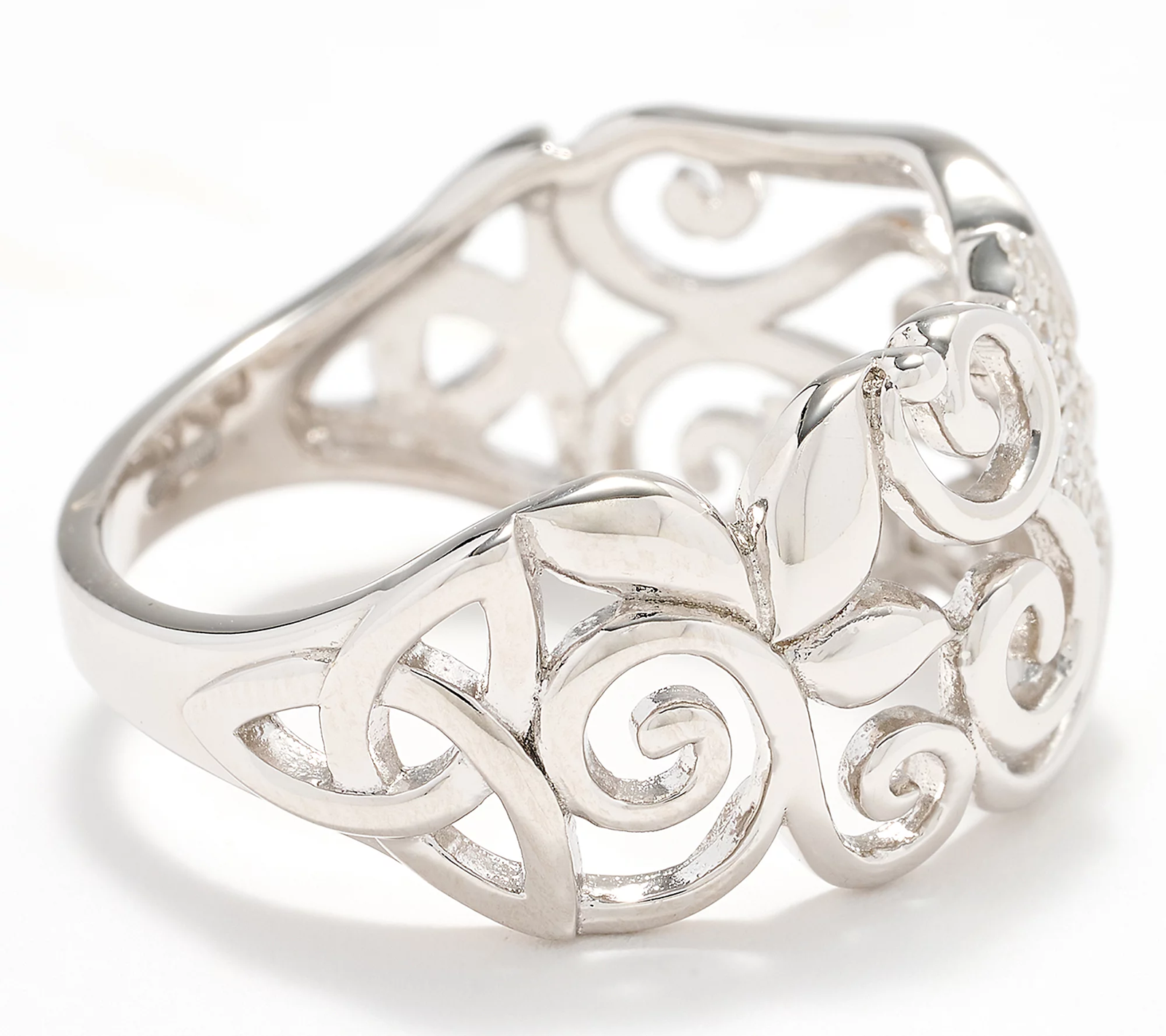 Embrace your Irish heritage with this charming Solvar band ring that combines a pave-set shamrock motif, polished trinity knot motif, and classic Celtic swirls. From Solvar.