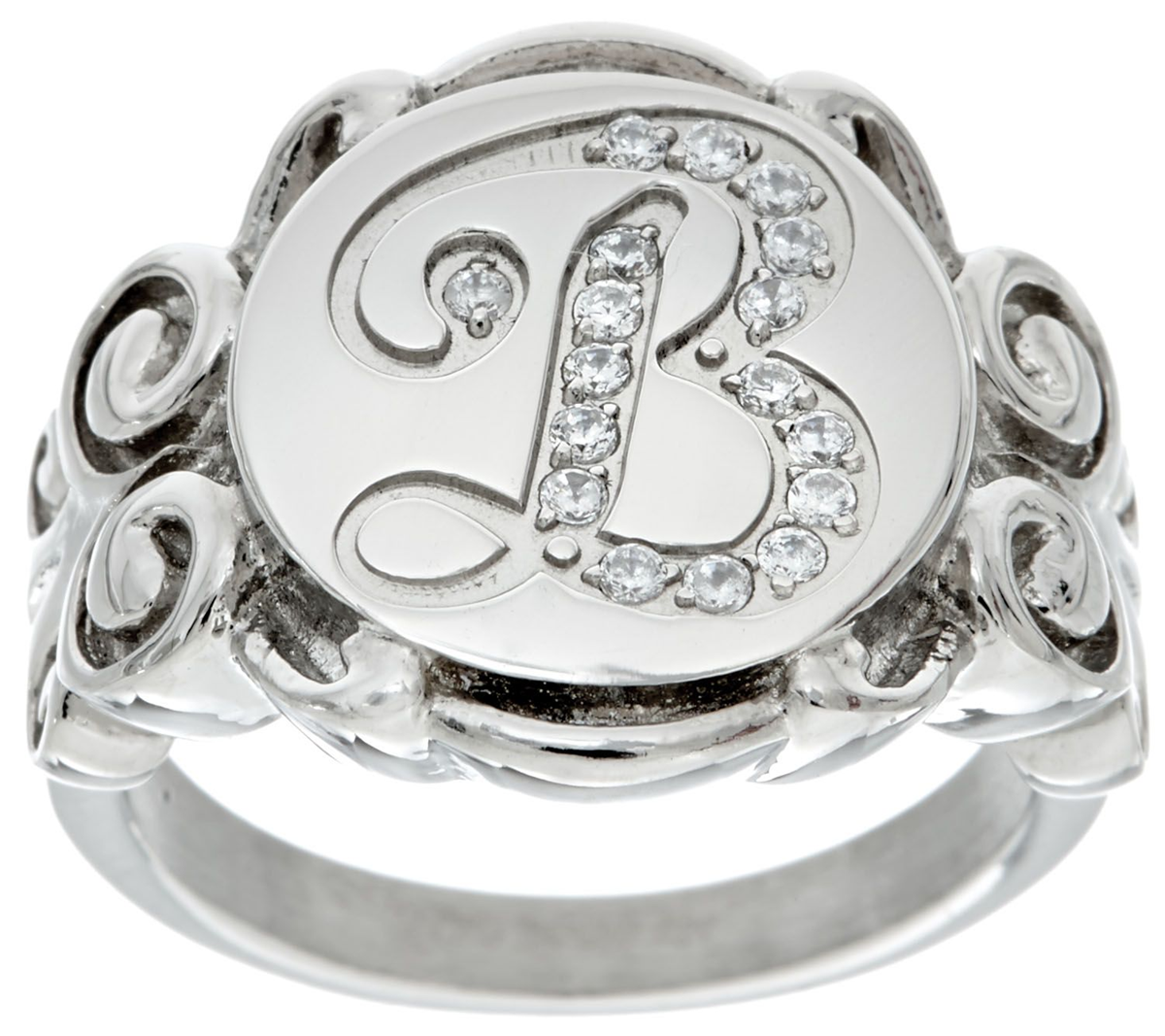 Make your mark with this stainless steel signet ring. Its center script initial is accented with clear crystals and a highly polished scroll design for a signature sense of charm.