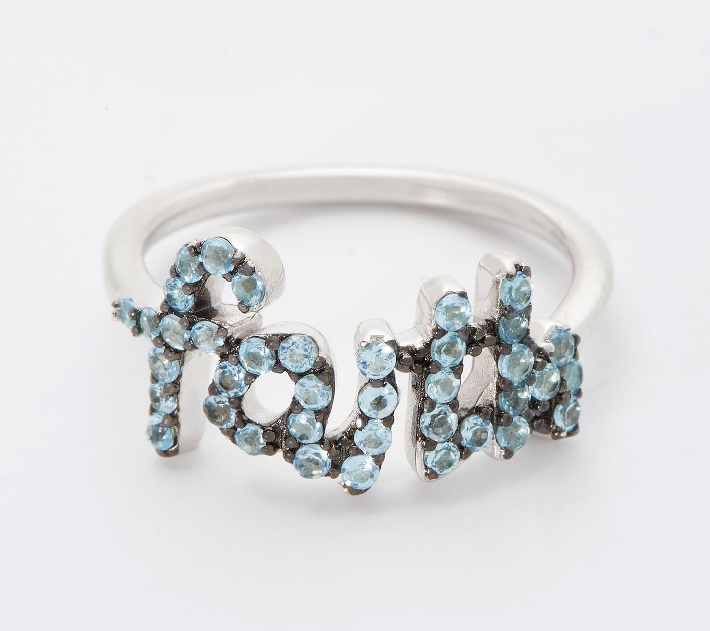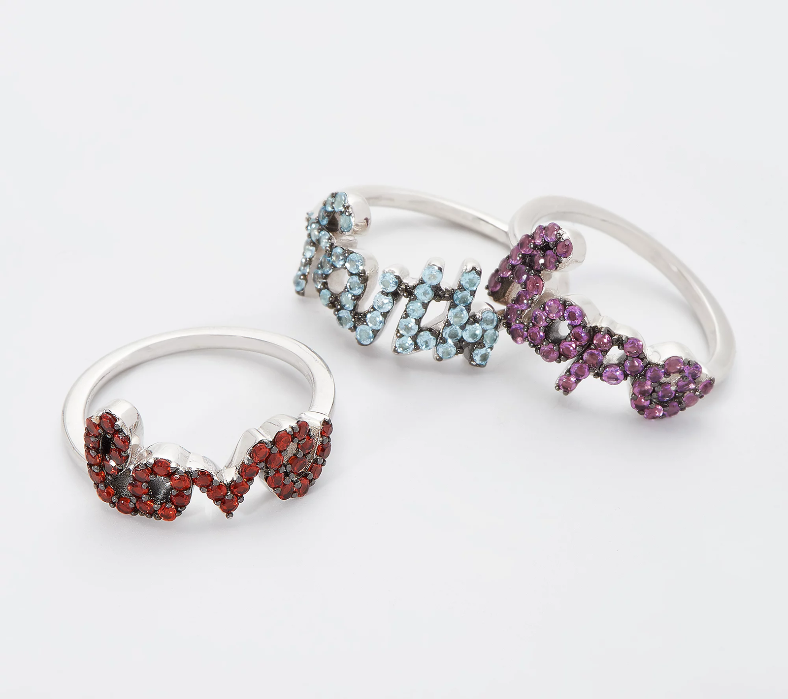 This ring has more to love than its vibrant gemstones. The sterling silver band is intricately worked into a script word of affirmation, so you get a shot of inspiration every time you look down.
