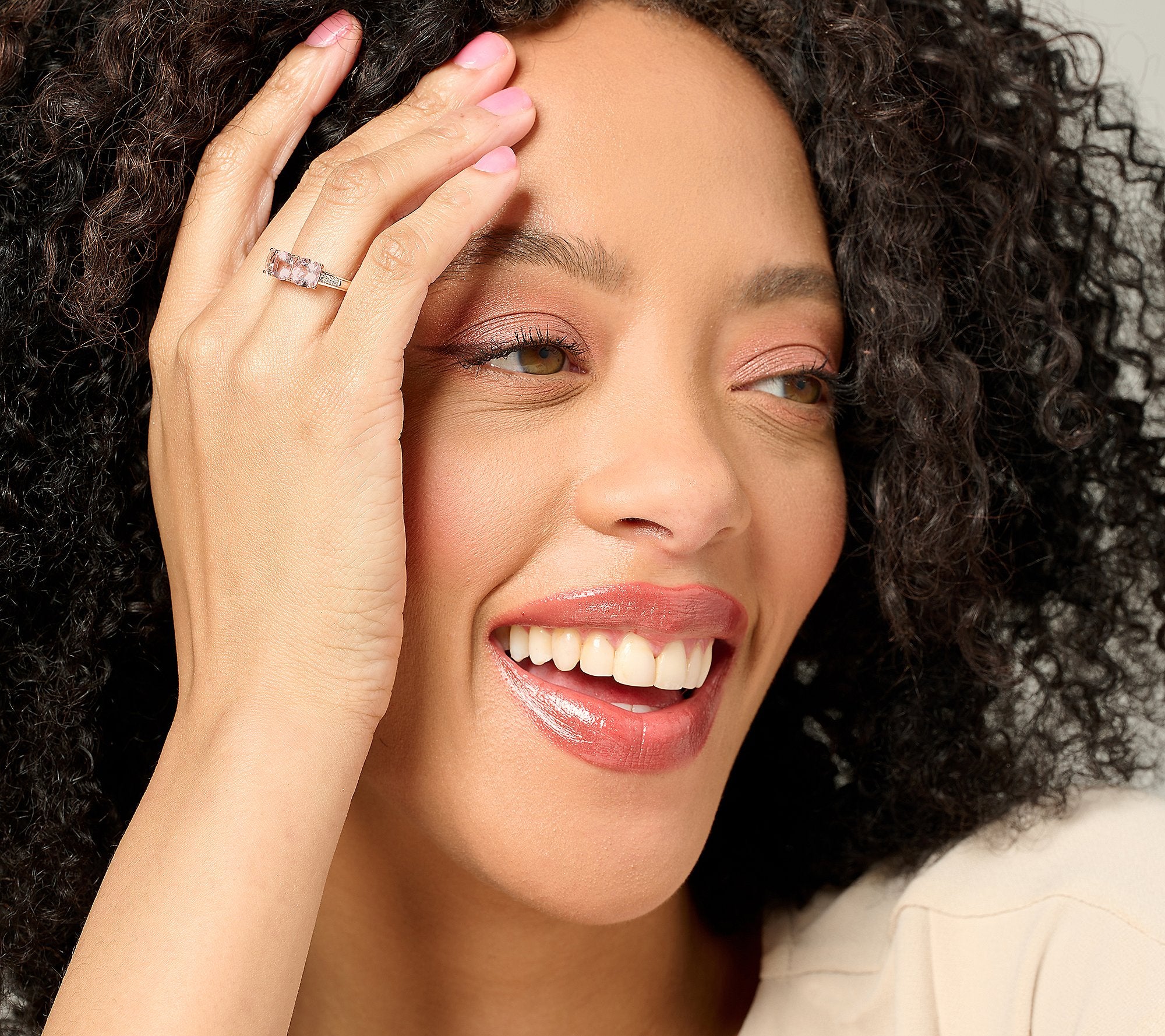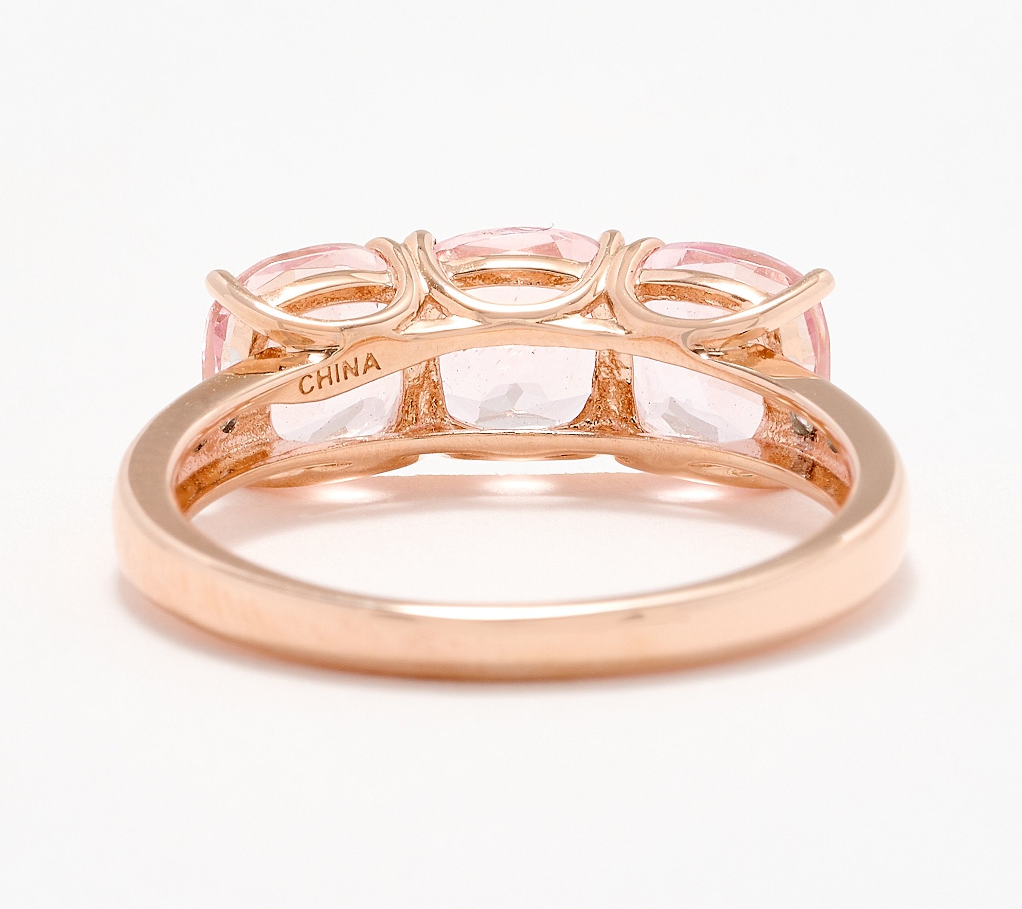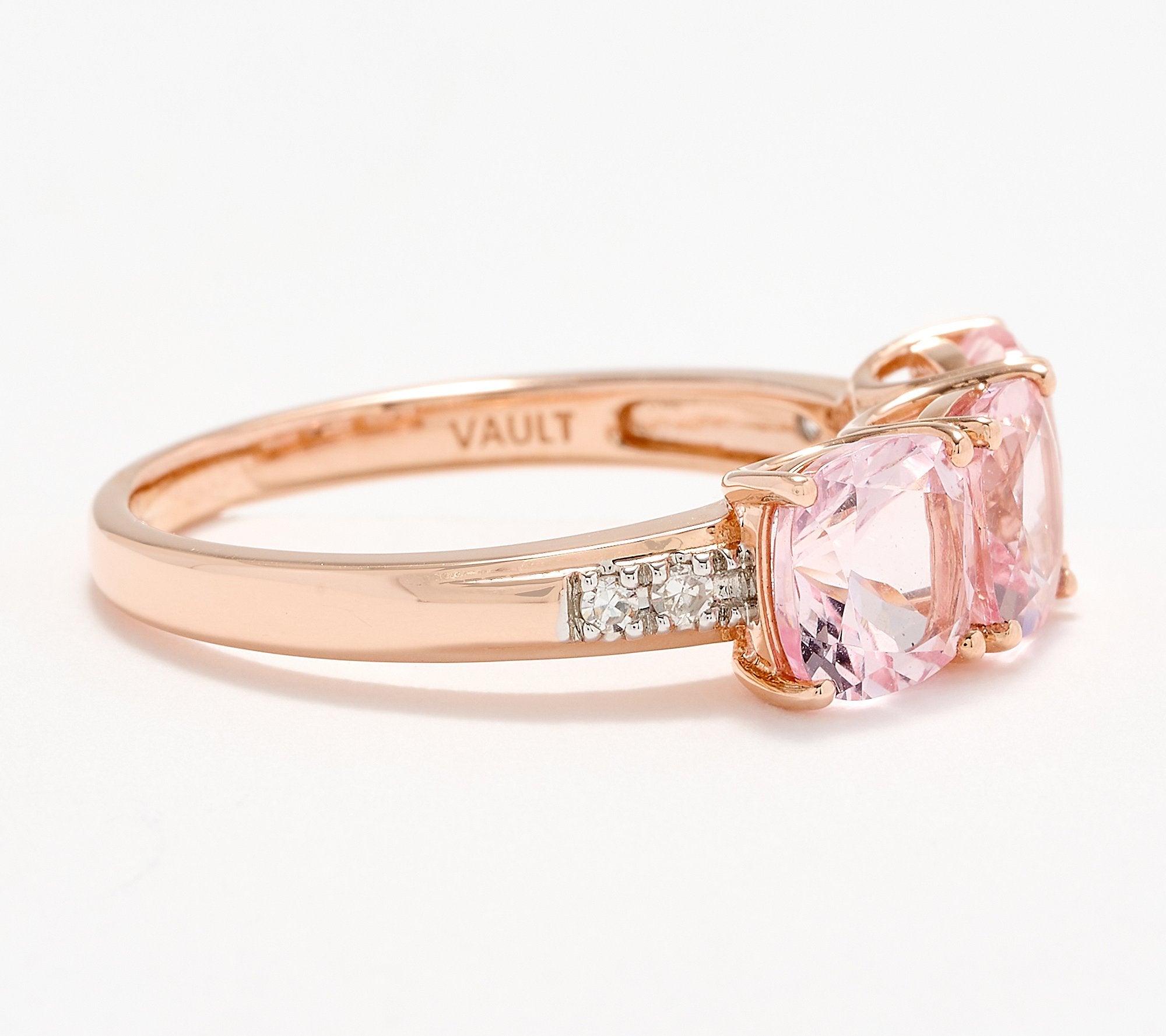 Color your world with sophistication through this exquisite pink morganite cushion band ring. The delicate pink morganite gemstones take center stage, flanked by shimmering white diamonds, all set in gleaming 14K rose gold. Perfect for special occasions or adding a touch of elegance to everyday outfits. From Vault Discoveries.